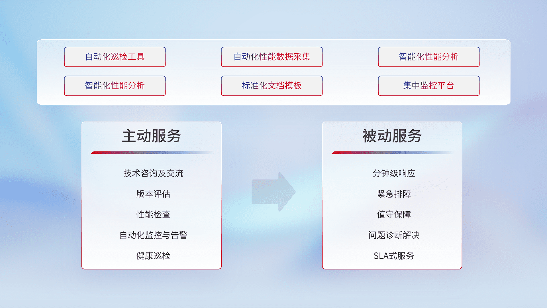 智能化工具和标准化文档,,,,保障服务质量,,,提供主动服务(包含技术咨询、、、、版本评估、、性能检查、、、、自动化监控与告警、、、健康巡检)和被动服务包含(分钟级响应、、、紧急排障、、、值守保障、、、问题诊断解决、、SLA服务)。。。