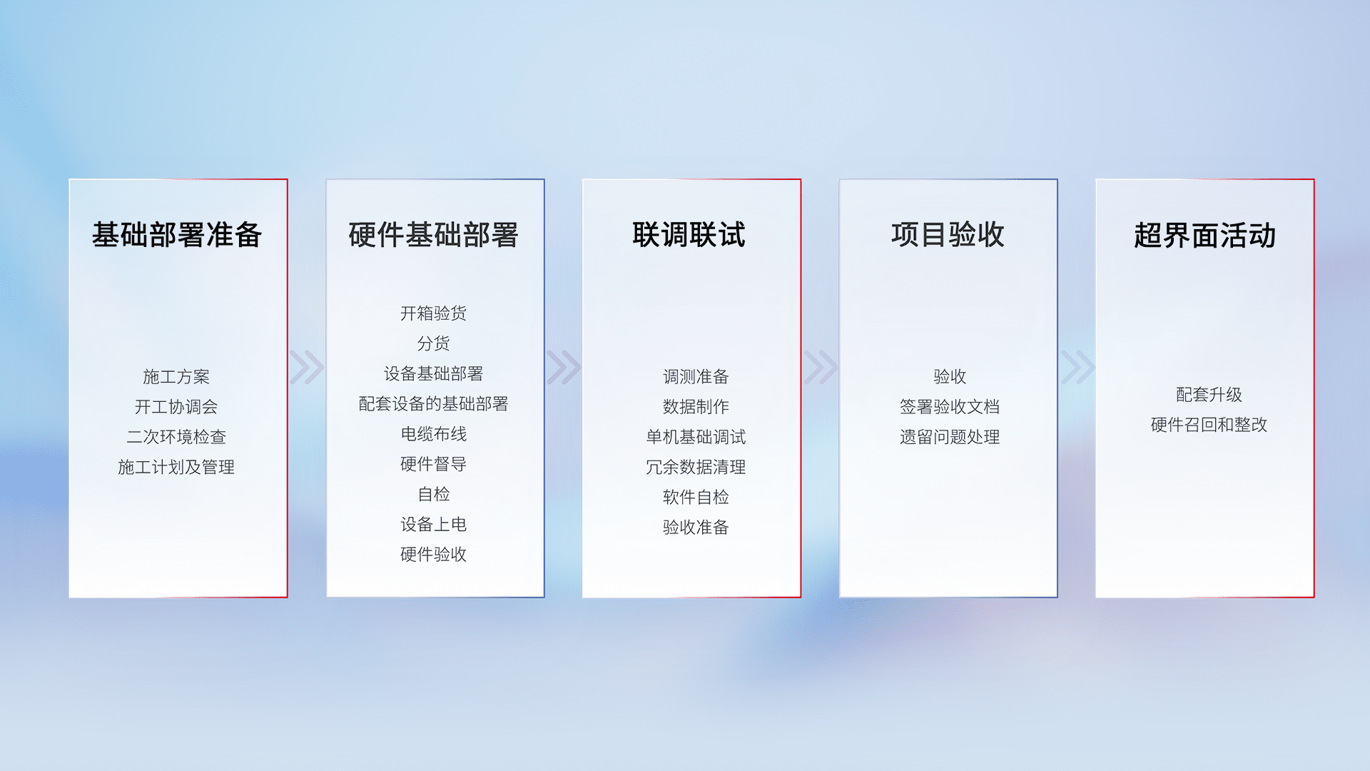 从基础部署准备、、、、硬件基础部署、、、、联调联试、、、、项目验收、、、、越界面活动的全过程可追溯,,,,保证施工质量和进度。。。