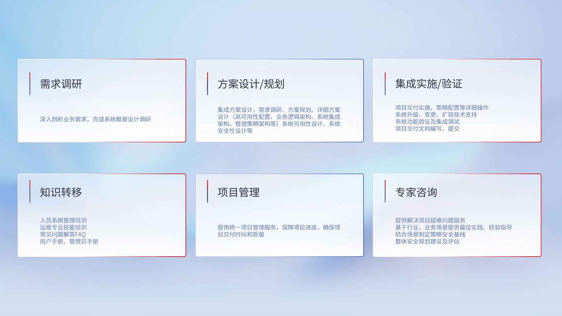 针对客户行业特性,,,将宏观的安全战略和需求,,,,通过专业的交付服务,,,,实现项目落地,,,为客户提供标准规范的集成交付服务。。。。